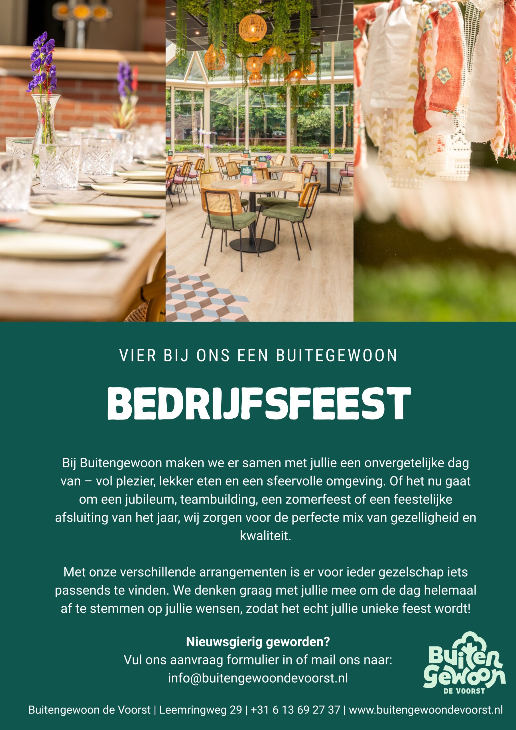 Tijd voor een feestje? Wij doen dat Buitengewoon! Neem contact met ons op en maak een keuze uit onze verschillende arrangementen. Iets op maat? Wij denken graag met jullie mee!