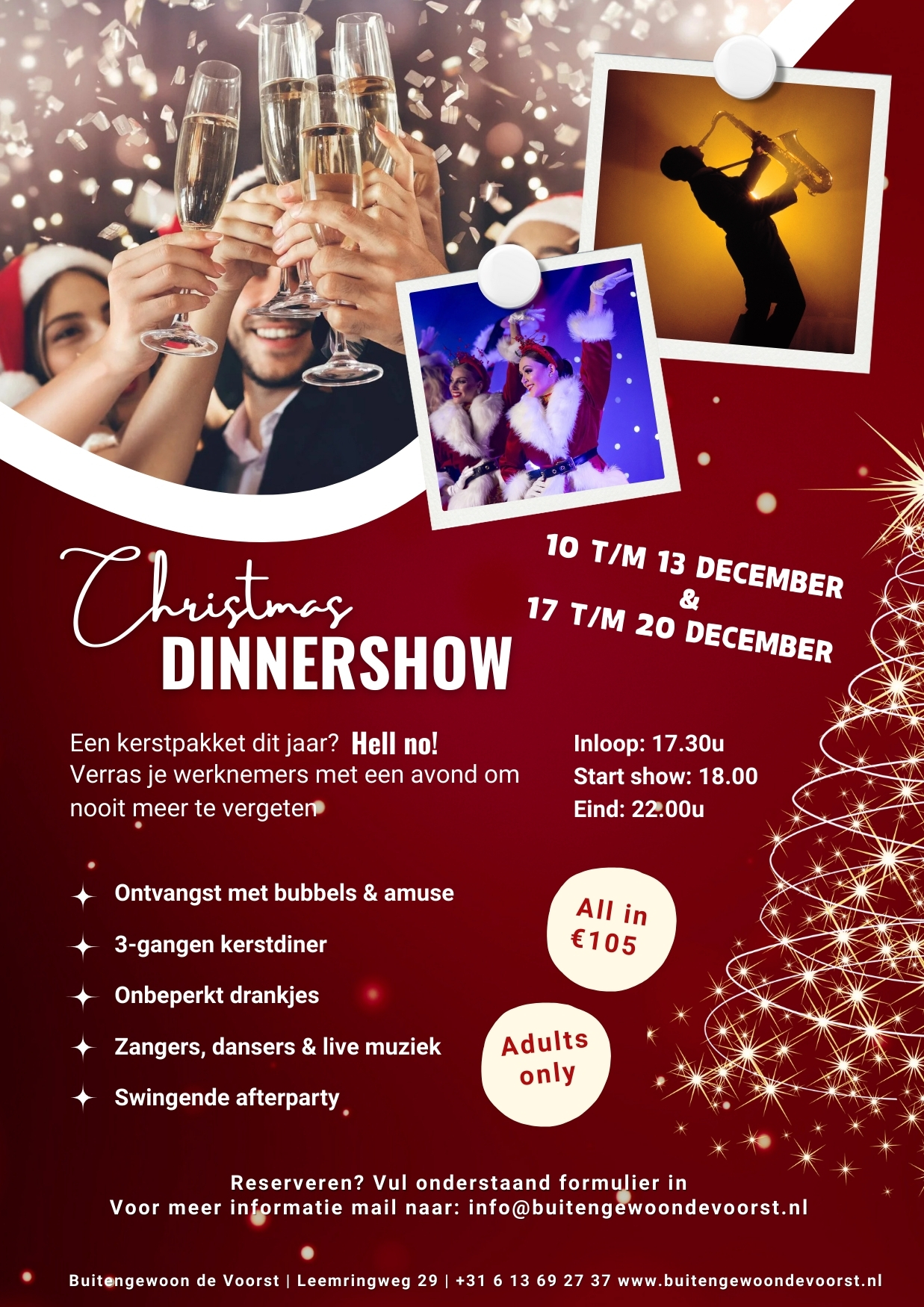 Verras je medewerkers met een avond om nooit meer te vergeten. Het kerstspektakel van het jaar de “Christmas dinnershow”. Geniet van een 3-gangen menu en laat je omverblazen door een show vol entertainment. Voor dit evenement is reserveren verplicht.