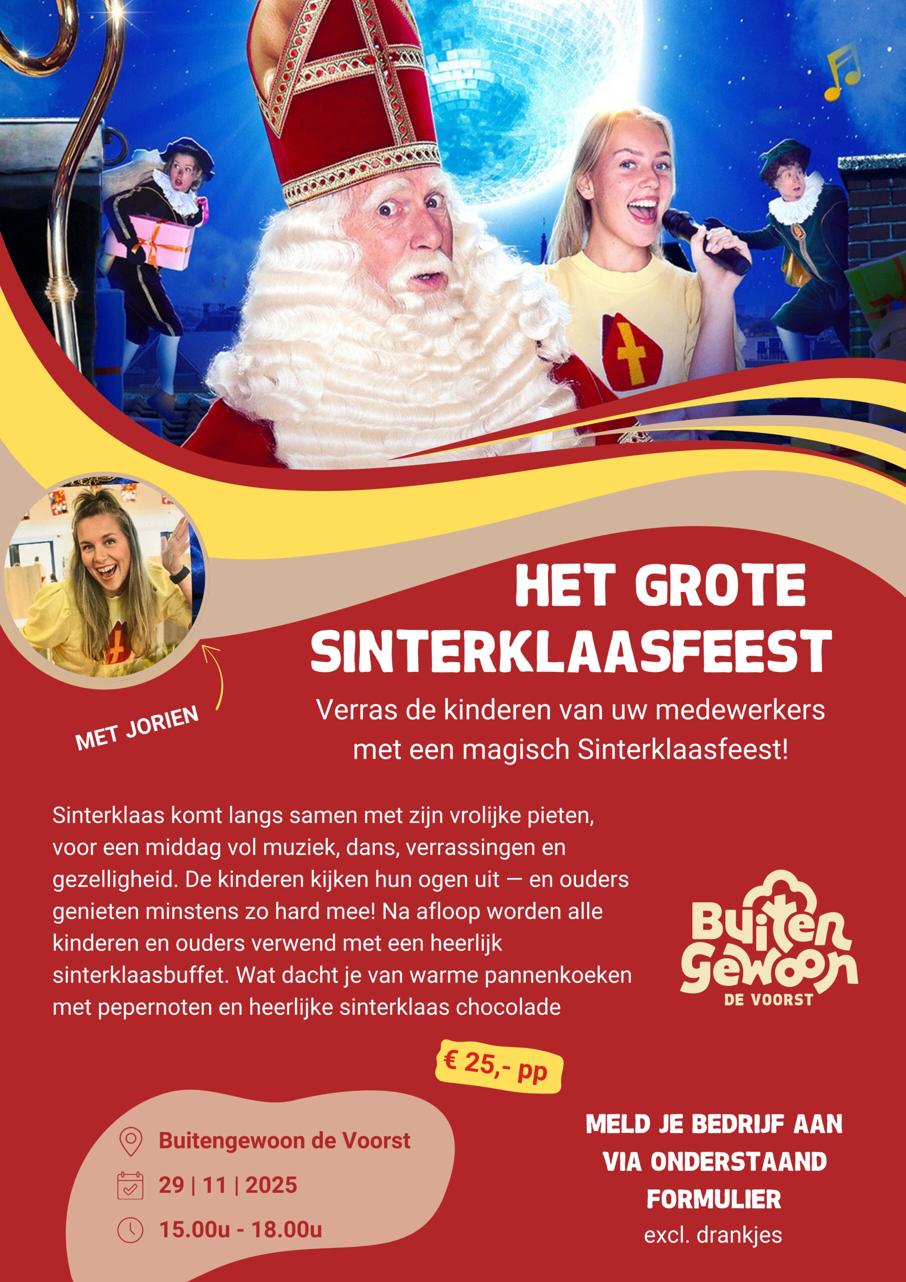 Het grootste sinterklaasfeest van het jaar is dit jaar bij Buitengewoon de Voorst! Verras de kinderen van je medewerkers met dit geweldige feest!! Dansen, zingen, spelletjes en natuurlijk mag een cadeautje niet ontbreken. Voor dit evenement is reserveren verplicht.